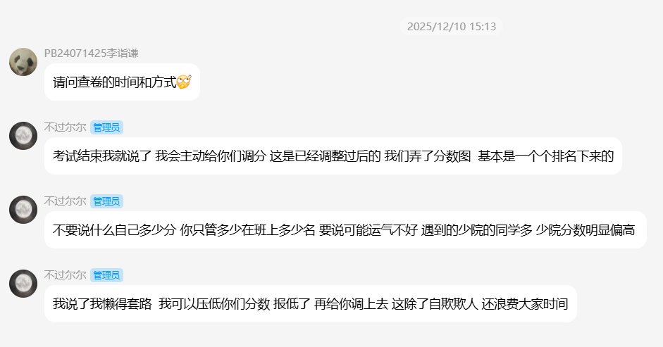 然后呢,在25年考试难度明显高于往年的情况下,在平均分非常低而且别的班都调分的情况下,说不调(甚至一开始还不让查卷),说什么为了公平云云。成绩分布图也不公布,排名也不说,还迅速解散了课程群。还在群里面说什么要不是教务处有要求他一分都不会调,所以只是捞了一下挂科的同学,上面的同学估计是没有怎么调分的。