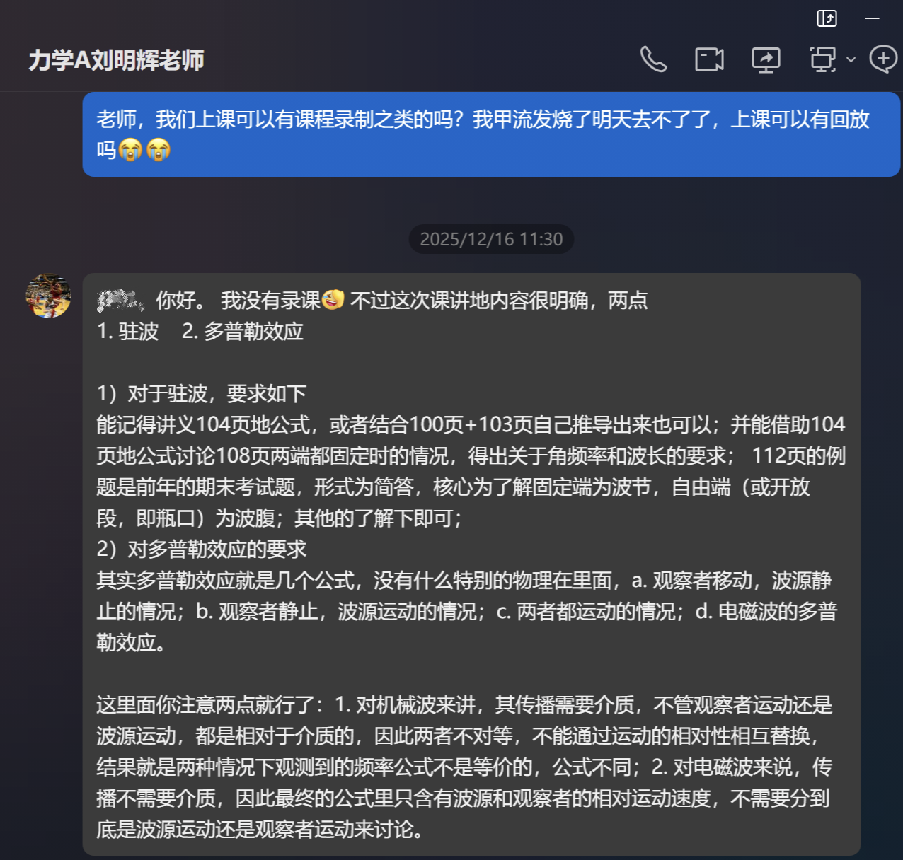 刘明辉老师真的是我在科大第一个学期遇到的最认真负责的老师了😭当时12月的时候我甲流请假了,听说有的课会有回放,顺口问了一句,老师告诉我没有,但是他非常仔细地给我回了上课的内容,这里贴一下截图()