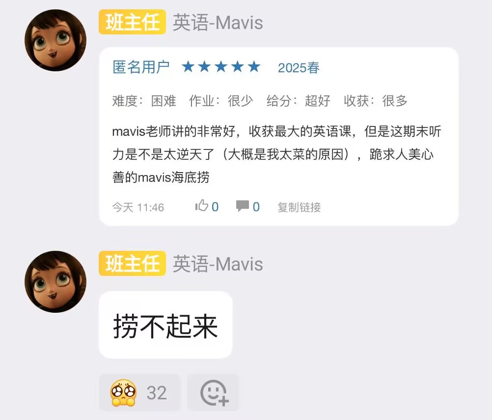 二更:mavis姐姐还是太人美心善了,在我听力小测和期末大抵是全部暴毙的情况下,捞到了3.3(可能上课积极发言老师对我印象比较好吧),给下一届xdx爆吹mavis!!!