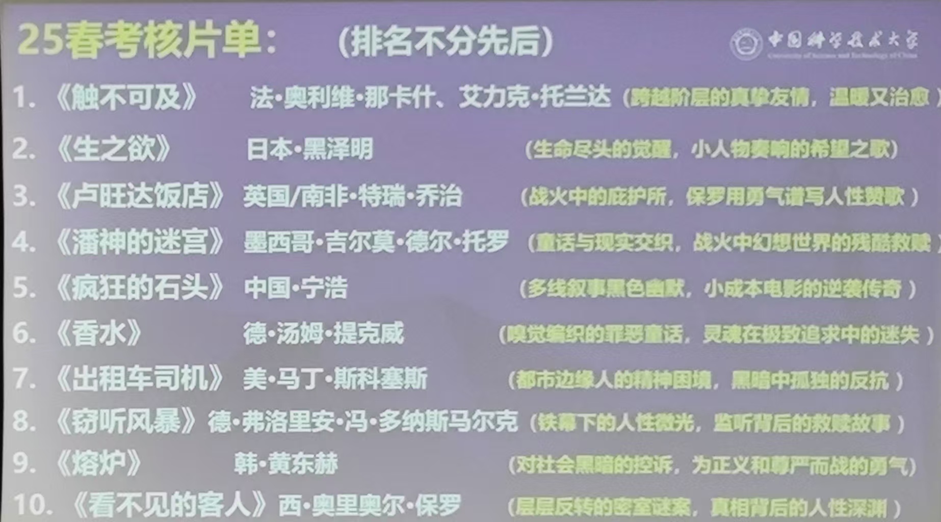 根据大作业选题范围和偶尔听课判断,老师的电影品味也就是学院派那水准。供选的十位导演都是库布里克,诺兰,斯科塞斯,斯皮尔伯格之流,十部电影也是《肖申克》《霸王别姬》这种大众高分片。做报告时简单聊聊电影的浅层cinematography还是比较吃香的,深谙天皇小津老塔杨德昌的kinophile还是建议不卷这两分。