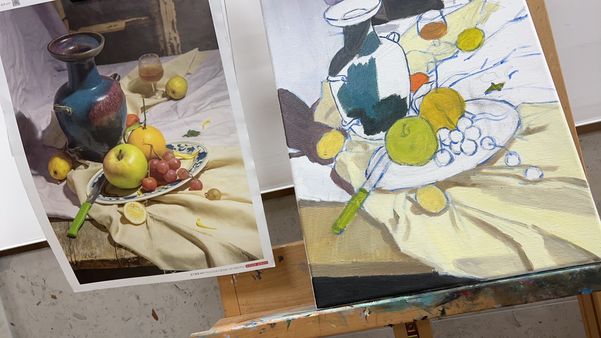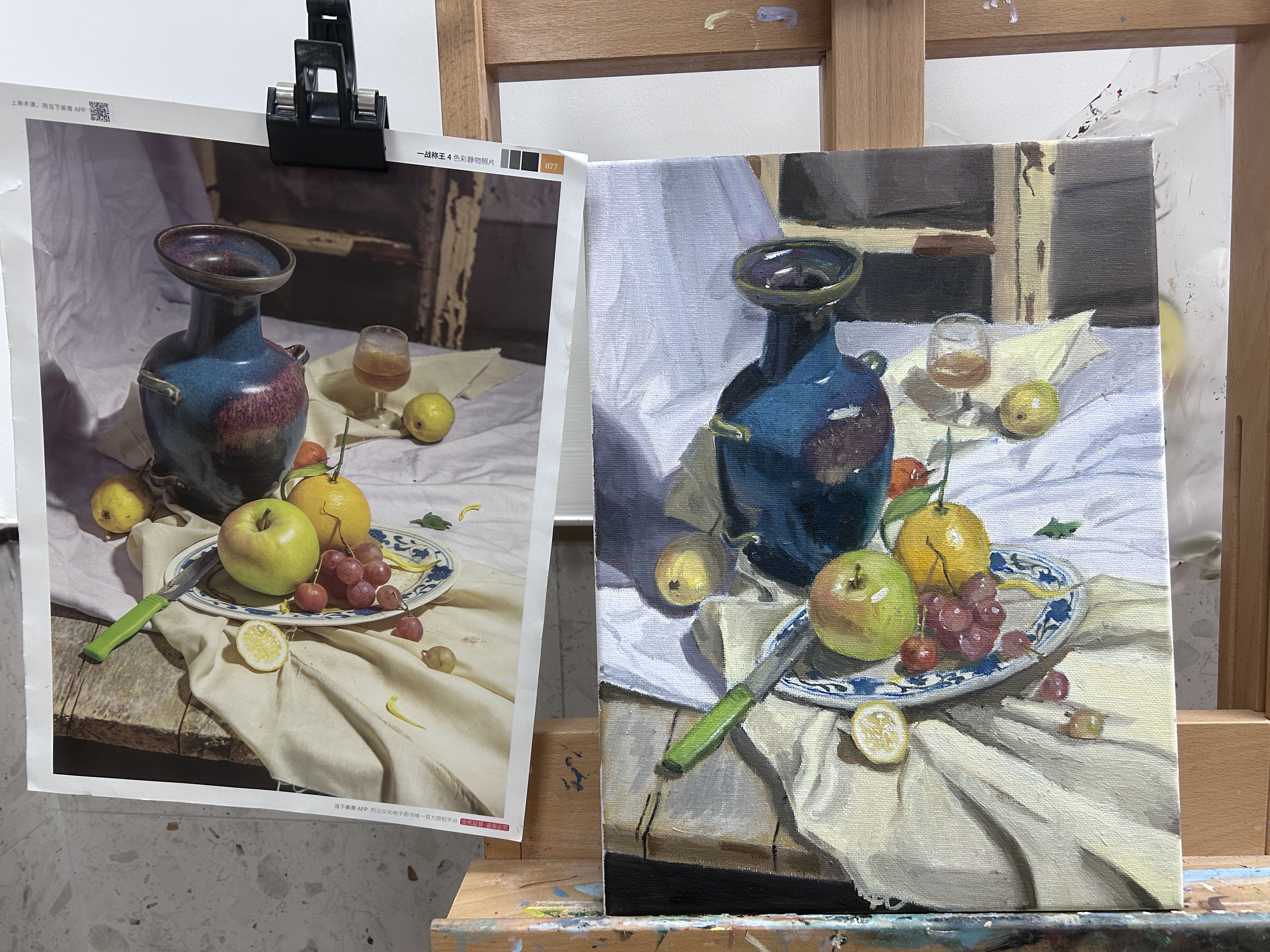 一个学期的安排大概是两幅临摹大师作品+一幅期末考照片写生,内容都是按自己喜欢的选(期末要求好像是画的照片含有6个物体就行,可以自由组合,一般老师会建议画简单的罐子水果就好(我想画花哈哈哈哈毕竟在能力范围内就选了张有一束多头玫瑰的画))平时周末/现代艺术中心有展览的时候画室都会开放,想多画点/赶进度/喜欢画的都可以去