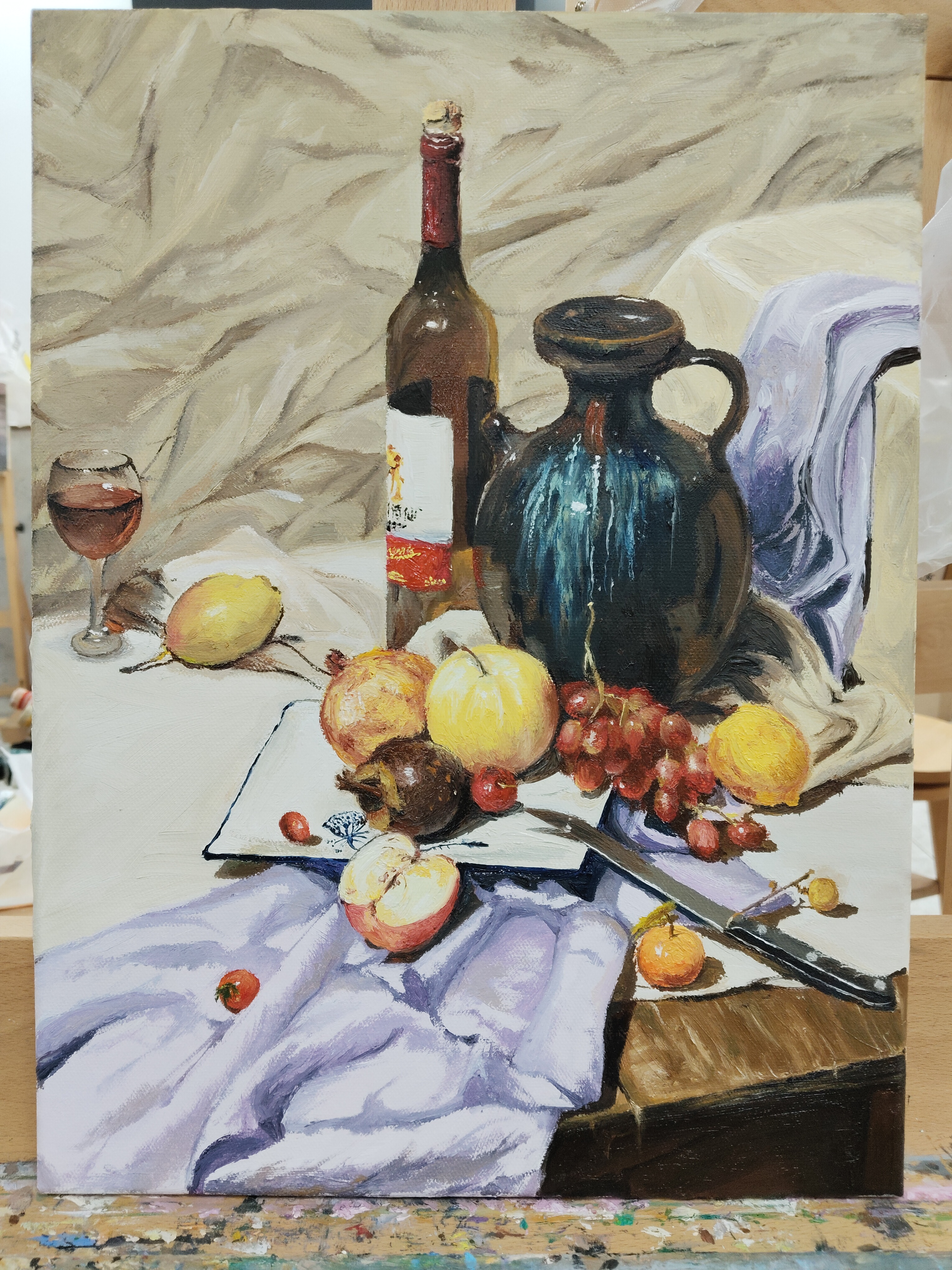 老师上课时间会一直指导绘画(指导的多是颜色倾向吧比如你这个颜色不知道怎么调就问老师之类的(我没印象了没问过),毕竟是油画课不会讲什么素描关系,但是感觉对完全没接触过素描/色彩知识的同学来说会有点点难理解难画好)