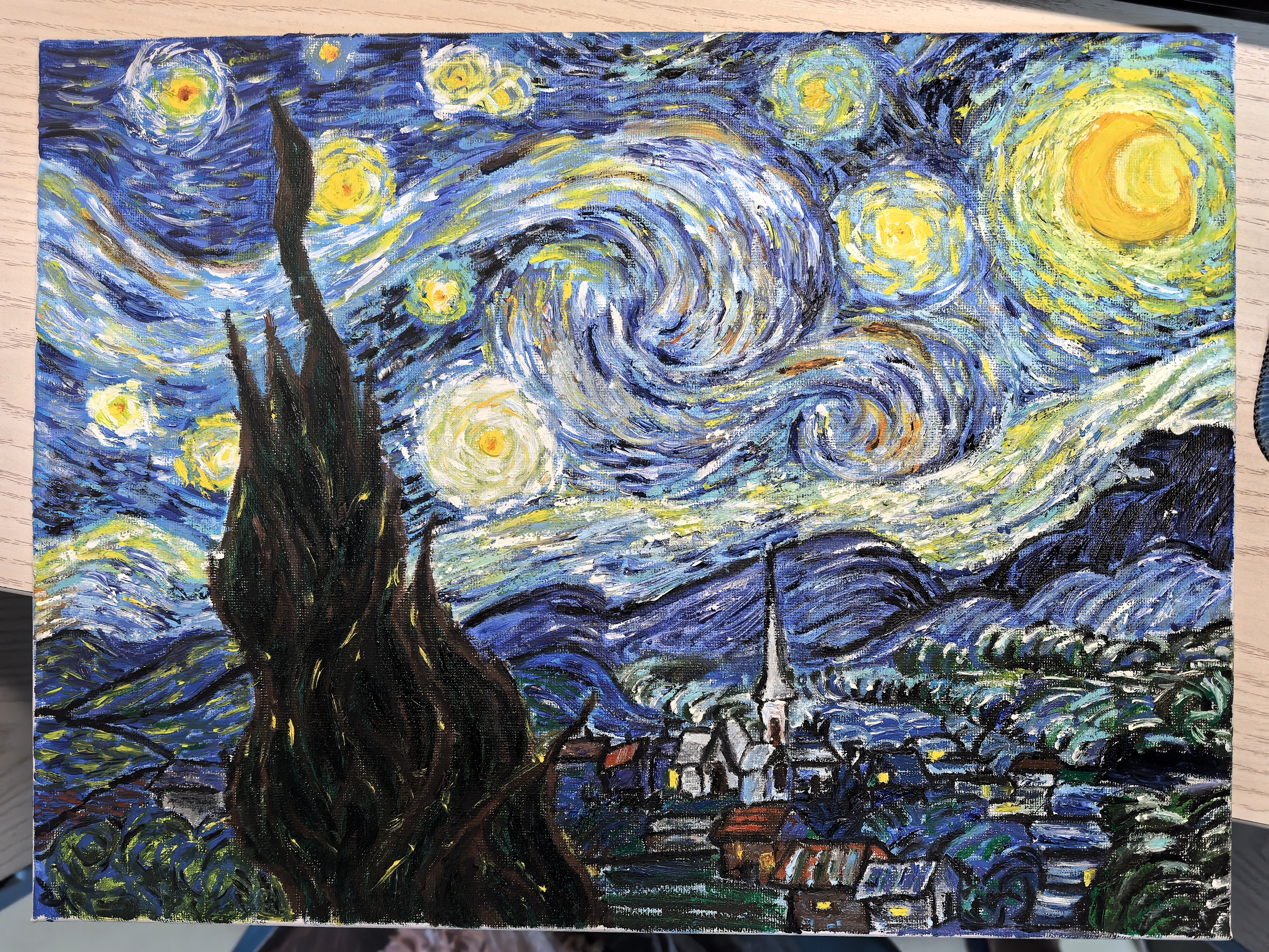上课内容就是一人一个画板,一套颜料和笔,自己画油画,前十周可以自行选择喜欢的作品进行临摹,最后六周完成一幅考核作品就好了。大概是熟悉绘画流程以及调色技巧,老师非常慈祥与温柔,如果有颜色调不出来可以找老师帮忙调,甚至有些地方画不出来也可以请老师帮忙画。平时有空也可以自己来画室画画。本人零美术基础,就是只会画火柴人的水平。最后包括考核作品总共画了三幅,虽然水平有限,但是感觉看着自己的作品还是挺有成就感的,打算拿回家挂墙上哈哈哈哈哈。