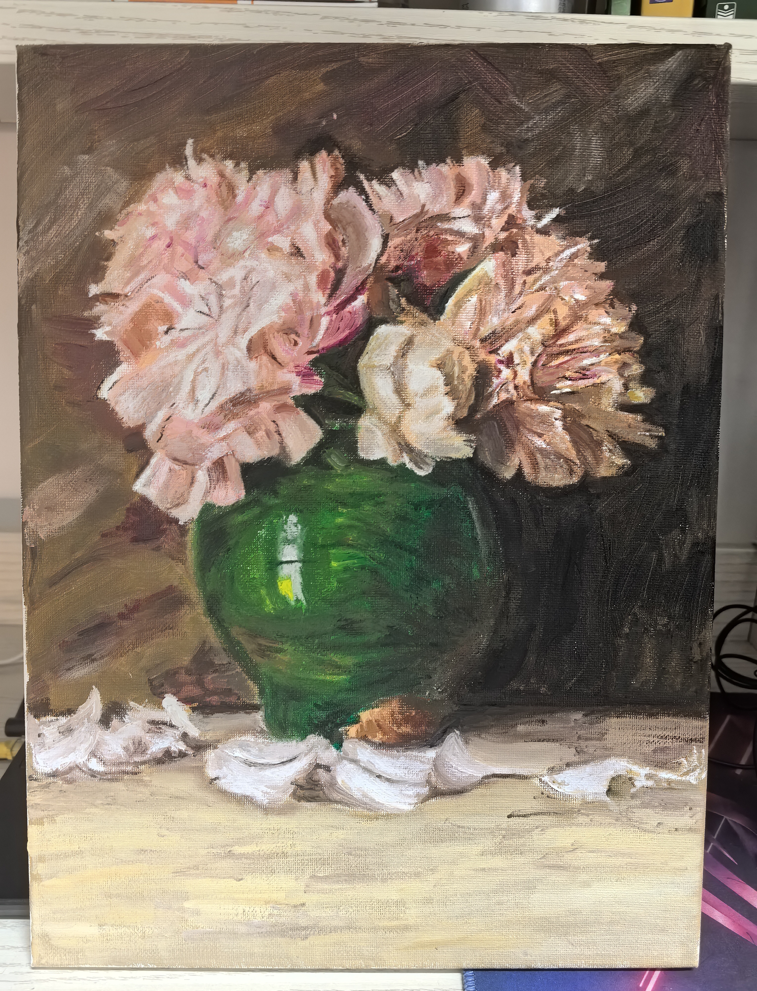期末画照片,是自选(我以简单为标准选的…躺了)。个人画了很久,最后要交的那段时间刚好差不多都结课了然后就去爆肝了俩下午抠细节。我主体物画小了(老师让我改大但我不知如何下手…),所以只能把前面的衬布画得很细…照片大多数是白色,有点空,又得在画里变成五彩斑斓的白。画完转了一圈,感觉自己的风格和大家比较迥异。大佬的画很有油画质感的美,我的画就像廉价打印机打出的照片(救命…)。花了心血的这幅画老师和同学给了优秀,非常感谢!