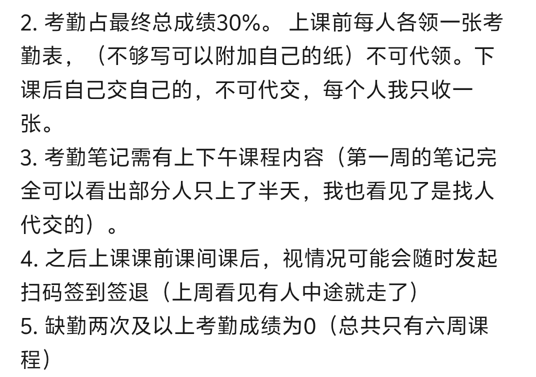 助教为了限制你上午下午都得来听课,特意要求笔记上必须同时具有上午和下午的课堂内容。其实这也就算了,大家意思意思到个课,随便记点笔记,交上去得了。但助教又突然要求交笔记时只能个人交自己的,不准代交?!原因竟然是她说她看到有人中途走了没听课什么的。不是,先不说你这波操作治标不治本,代交≠没来听课好吧!整天上课板起个脸,认为所有人都欠你五百万似的,收作业的时候还苦瓜脸盯着人看。然后闲得慌又搞出个二维码实时签到,还要求定位?这就很何意味了。你水课要有水课的自觉好吗?!你当个助教,这么用心抓一门水课的到课率是何意味呢?你想搞斩杀线是吧?你抓住几个没上课没签到的,难道你老板会给你涨工资?!研究牲何苦为难研究牲呢?!