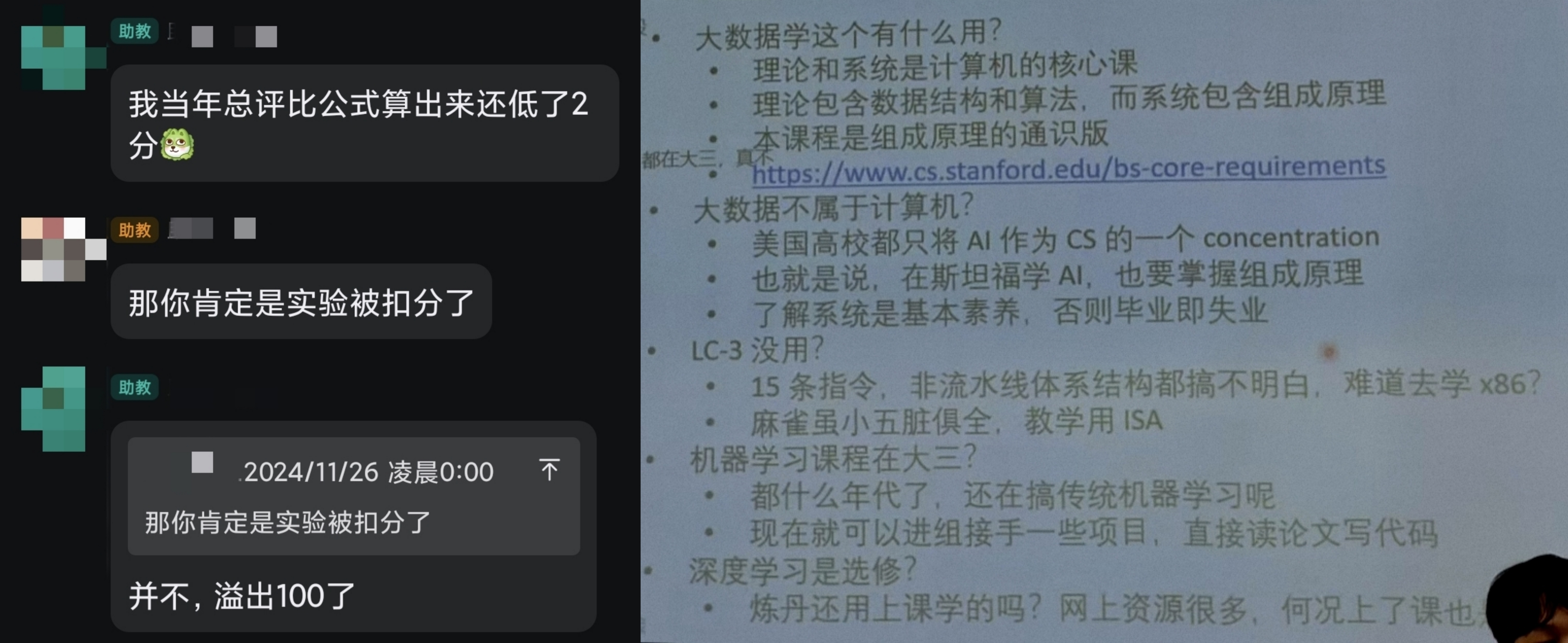 考试与给分:全英文的超长试卷,大量隐藏的神秘陷阱,填彩票般的程序推理,考验与出卷人的心灵感应(训练学生上下文推理时一次性处理的最大 Token 序列长度),逆天的十六进制机器码(快进到 5 年后整张试卷全是 base64 编码,大家都是人肉翻译器)。给分是 作业 : 实验 : 期中 : 期末 = 1 : 4 : 2 : 3,课堂互动与小测有附加分,实测在优秀率爆了下调的情况下,等于给没有附加分的同学减分。