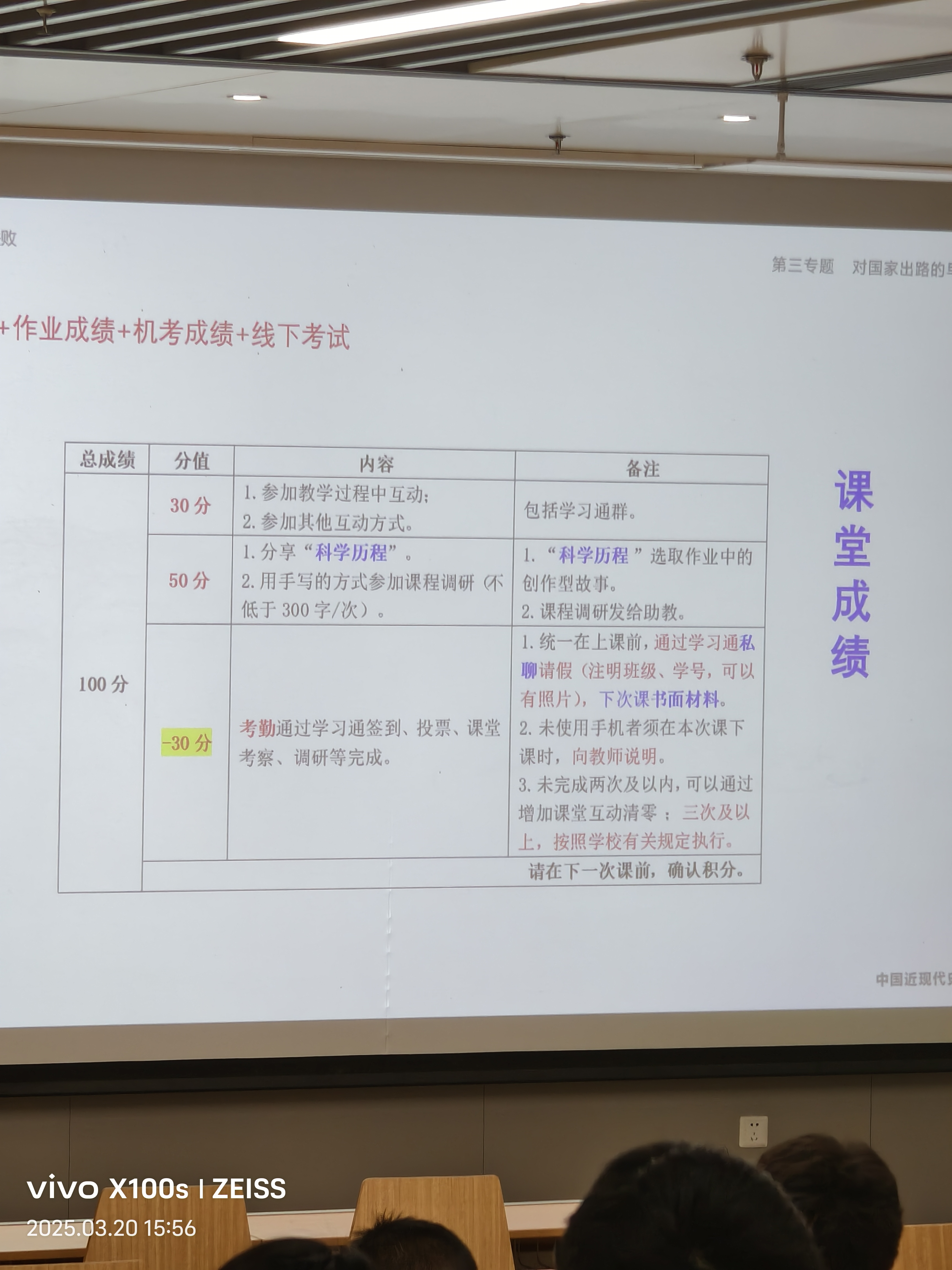 平时分:满分100,一次互动30或50,比较容易满。30的有:回答问题、上课期间根据要求找资料发到群里、把自己的作业朗读语音发到群里;50的有:困难的问题(比如背诵沁园春·雪)、课前自制ppt讲解2-3分钟的历史知识、期末的网上评教(在第18周,所以别急)。
