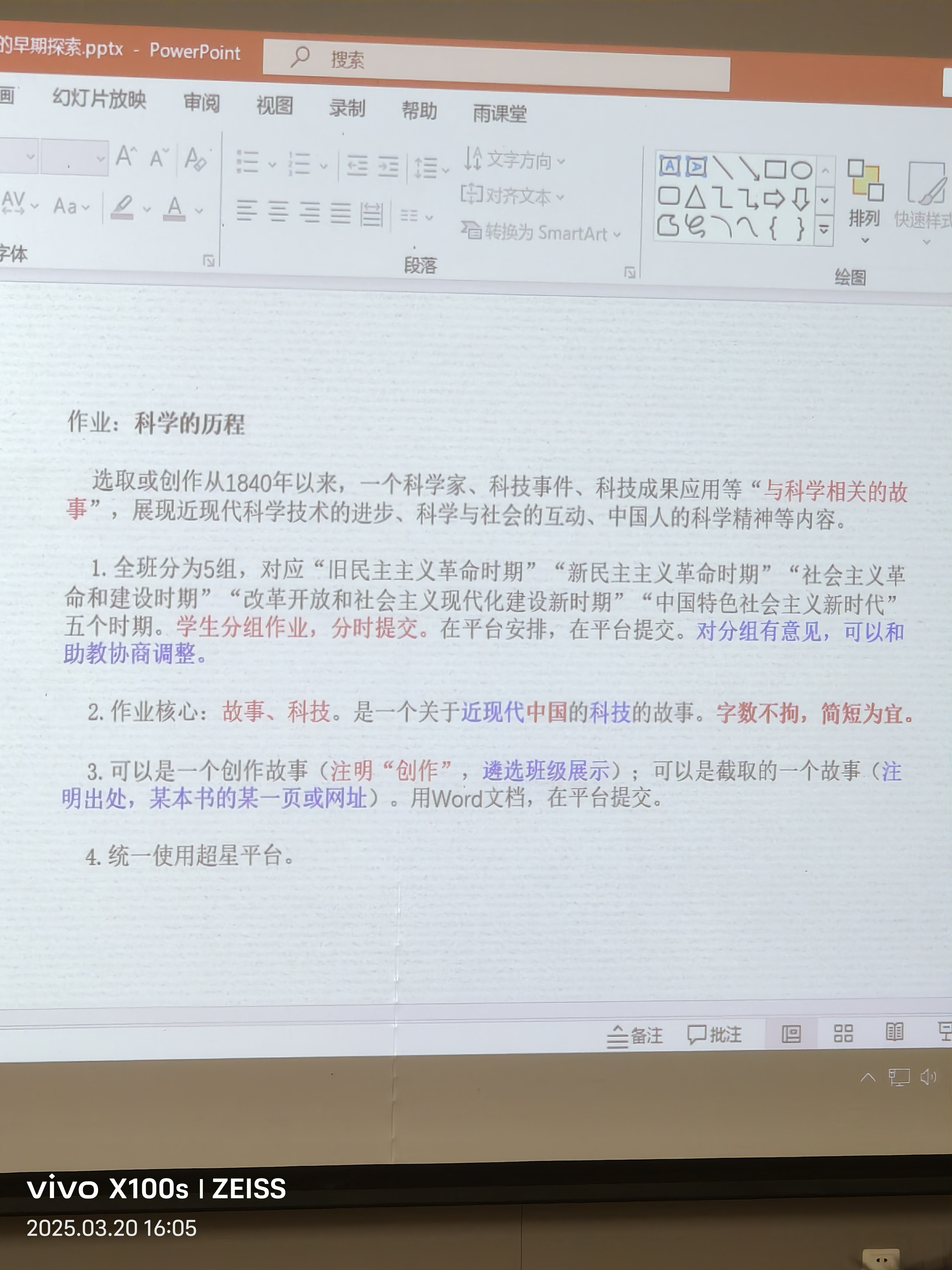 大作业:以“科技”为核心分别调研近现代中国的真实故事或者创作一个故事,下文有图,其实你直接截取别人写的也可以。分组给定了近代史中的时间范围,不过我根本没注意科技,写完了发现才有这个要求。不过钱老师说,既然写过了就不用重新写了,于是就直接交了,然后还被选上去展示了。
