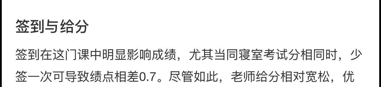 签到在这门课中明显影响成绩,尤其当同寝室考试分相同时,少签一次可导致绩点相差0.7。