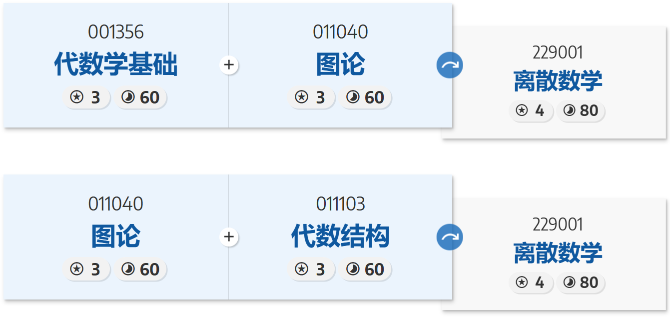 可能用到的替代关系如下图,计科的代数结构开在秋季,数院的代数学基础开在秋季,想深入了解数理逻辑的可以考虑选择计科的数理逻辑基础。(离散数学在秋季开设给 DS,春季开设给 AI,两位老师的课堂风格迥异,大家可以根据自己的喜好自行选择,然后提前一学期修读)