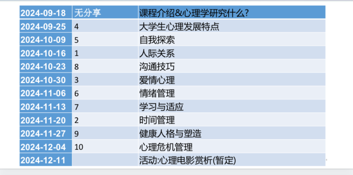 除了汇报和最后的论文,本学期还有两次作业,用GPT糊弄一下就行。大学生心理学这门课我一直觉得没有任何必修的必要性,可能是硬性要求吧。除了更加占用时间之外,我不觉得这门课对我的心理健康有什么帮助。而且老师给分不太行,可能因为老师是新来的。不过老师人还可以,没有什么大问题。