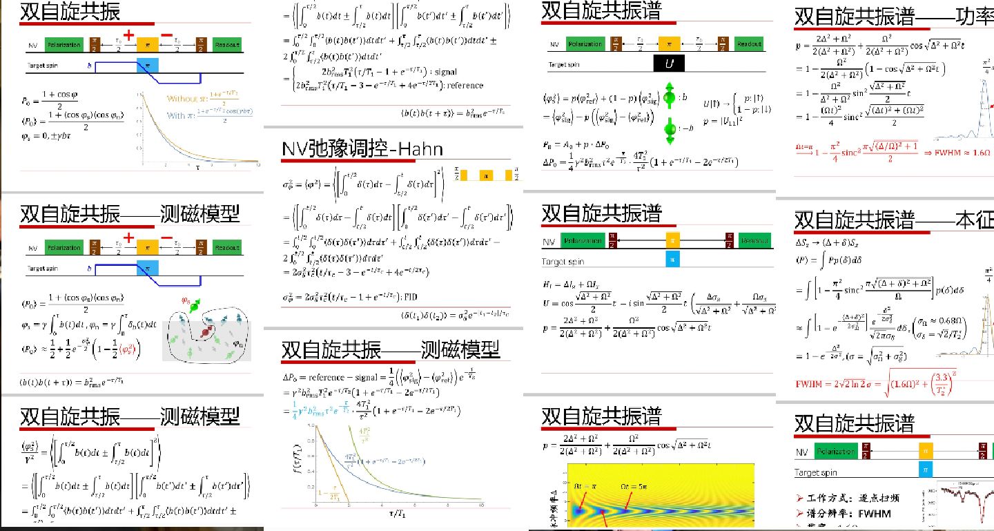 第二道大题那些双自旋磁共振我不是很懂,复习的时候也没当重点,孔飞老师的ppt太多了(考前有一次复习课,老师会讲下重点,但这个双自旋磁共振老师就提了一下,背了一堆前面的NV调控和测磁灵敏度那些),尤其是后面那一部分的逻辑,只能说有点抽象,我不妨贴出来给大家欣赏下: