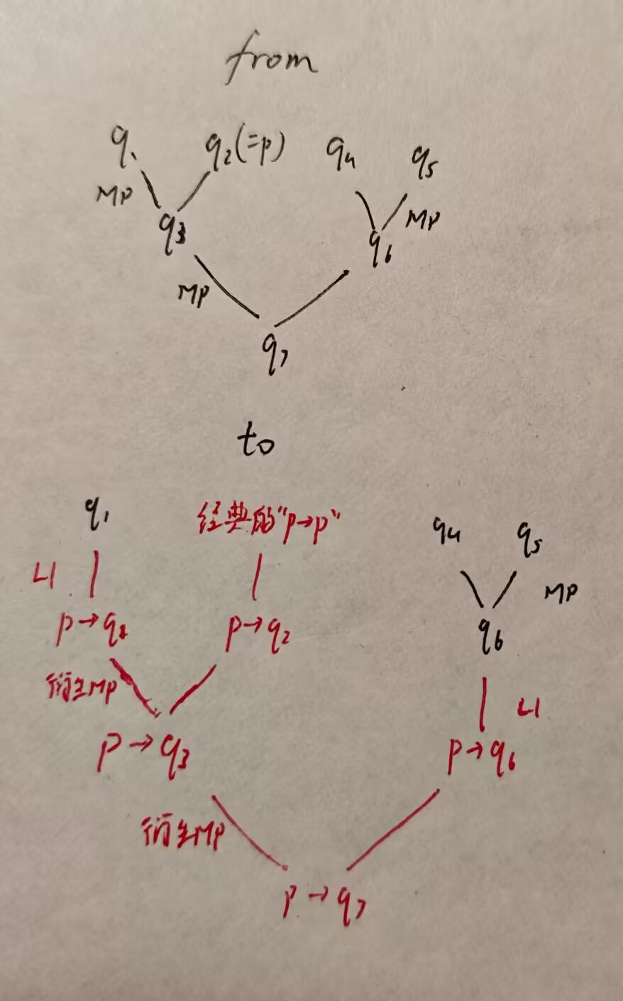 我们回顾证明序列的每一个公式, 在前面添加上 “q→…” 试图重现整个证明. 注意到 ③ 做如此改写后形如 q→(p→q) , 本身就是一个公理, 没有必要再从改写后的 ①② 推出. 所以我们先写出 ③' : q→(p→q) 随时备用.