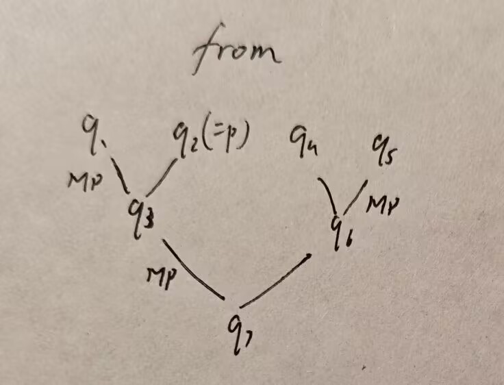假定我们现在已经有了 Γ∪{p} |- q 的证明序列 (q_1,q_2,…,q_n=q) , 想要写出一个 Γ |- {p→q} 的证明序列. 我们知道直接证明的定义虽然是链式的, 但它实际上有着如同二叉树的结构: 从最后的结论往前回溯, 每一个公式要么是由它之前的两个公式 MP 得到, 要么是一个公理/条件. 所以我们可以把证明序列 {q_n} 写成 (非完全) 二叉树的形式. 以下是一个示例: