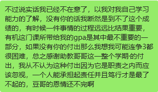 这是出成绩之后我跟豆哥的聊天记录截屏,这是我在期末周的力竭状态下敲的,虽然语无伦次,但此皆肺腑之言,认识豆哥这样一个优秀善良的朋友才是我这学期这门课所带给我的最大的收获。