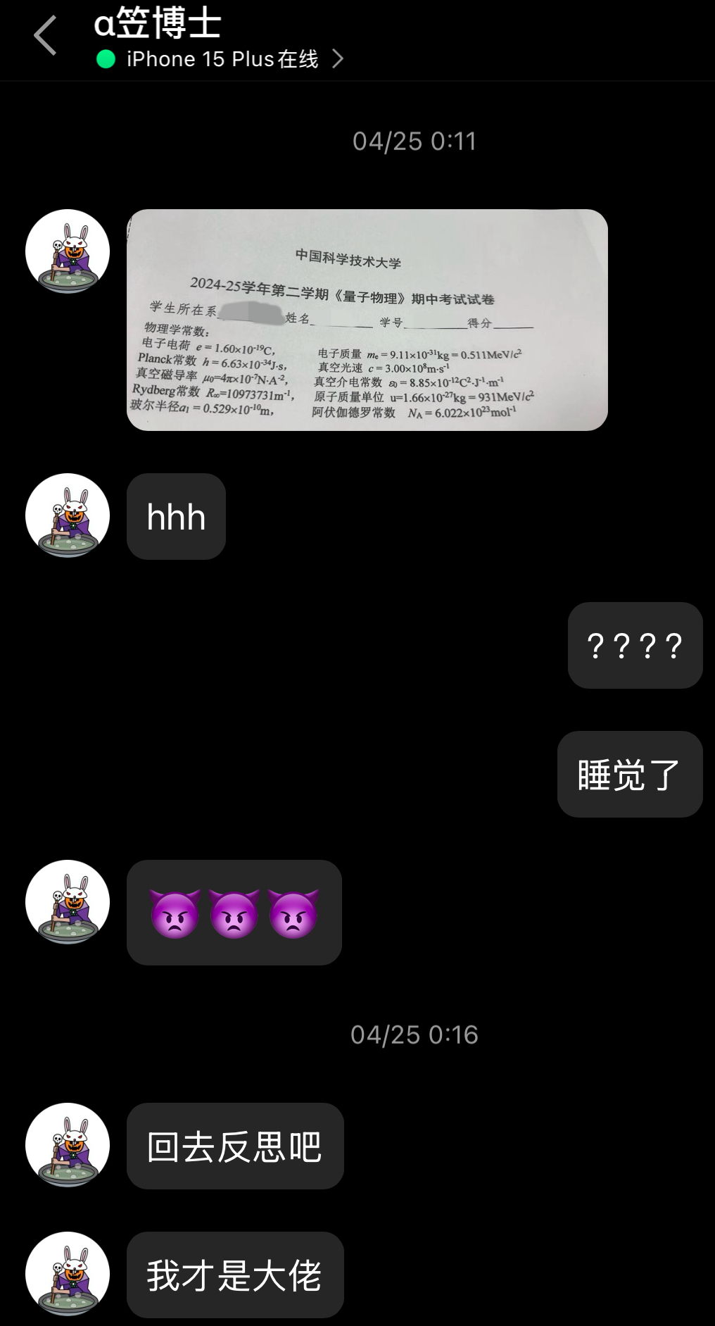 这次在课程群“2025春季学期量子物理”里发布的道歉声明,有一部分文字显示起来是心形符号,可能造成了大家的误解,这是因为我使用了付费的QQ装扮字体,我并没有混淆是非的意图。