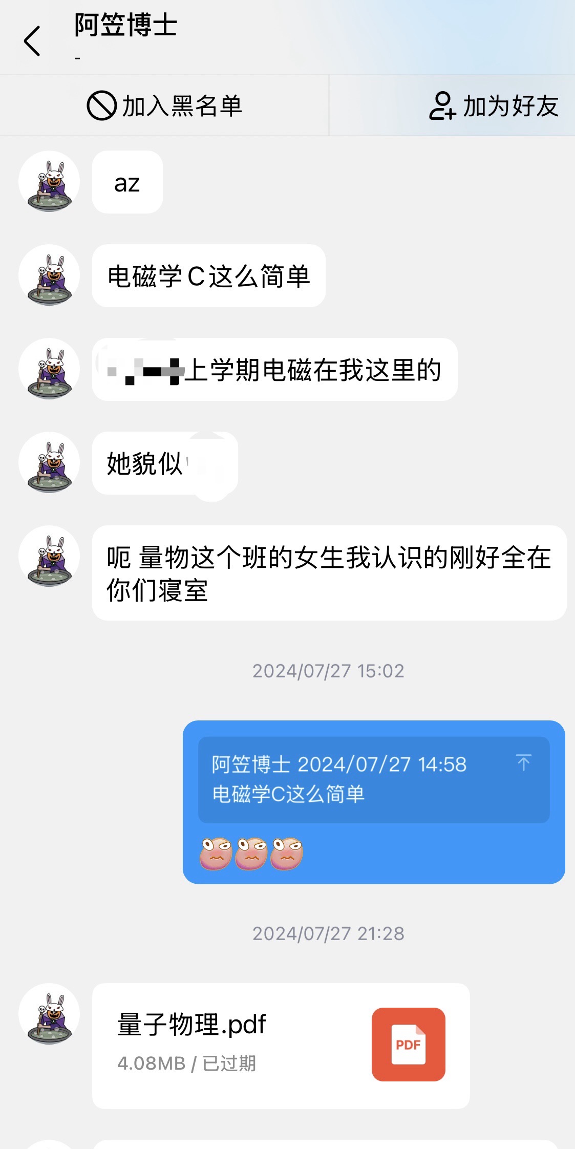 很多同学说这位w助教非常负责,我一开始得知其整理电磁答案和量物资料的时候也是这样认为的。那是什么时候开始改变想法的呢?半个月前很多同学都开始申助教,而我因为没有哪门课成绩特别突出,于是在QQ空间表示下学期可能当不上助教了非常遗憾,并且问了一句有没有我可能能带的课程。于是你们的w助教就来私信我建议带电磁,“不会的我教你”。本人纯种数学人(w助教知道这件事),方向可以说和电磁毫不相干,自然不会无聊到去带电磁学误人子弟。我拒绝后他立刻改口说,不建议带助教,钱少事多还没什么用。还有脸说别人双标,谁双标得过您啊?那我请问,如果w助教真的认为带助教这么不值,为什么一开始要推荐我带电磁呢,英雄救美的动画片看多了?自己当助教又是出于什么意图呢?到底是真心实意地想帮助同学学习,还是只是喜欢整理资料带来的满足感,顺便树立聪明善良尽心尽责的人设,方便自己胡作非为?