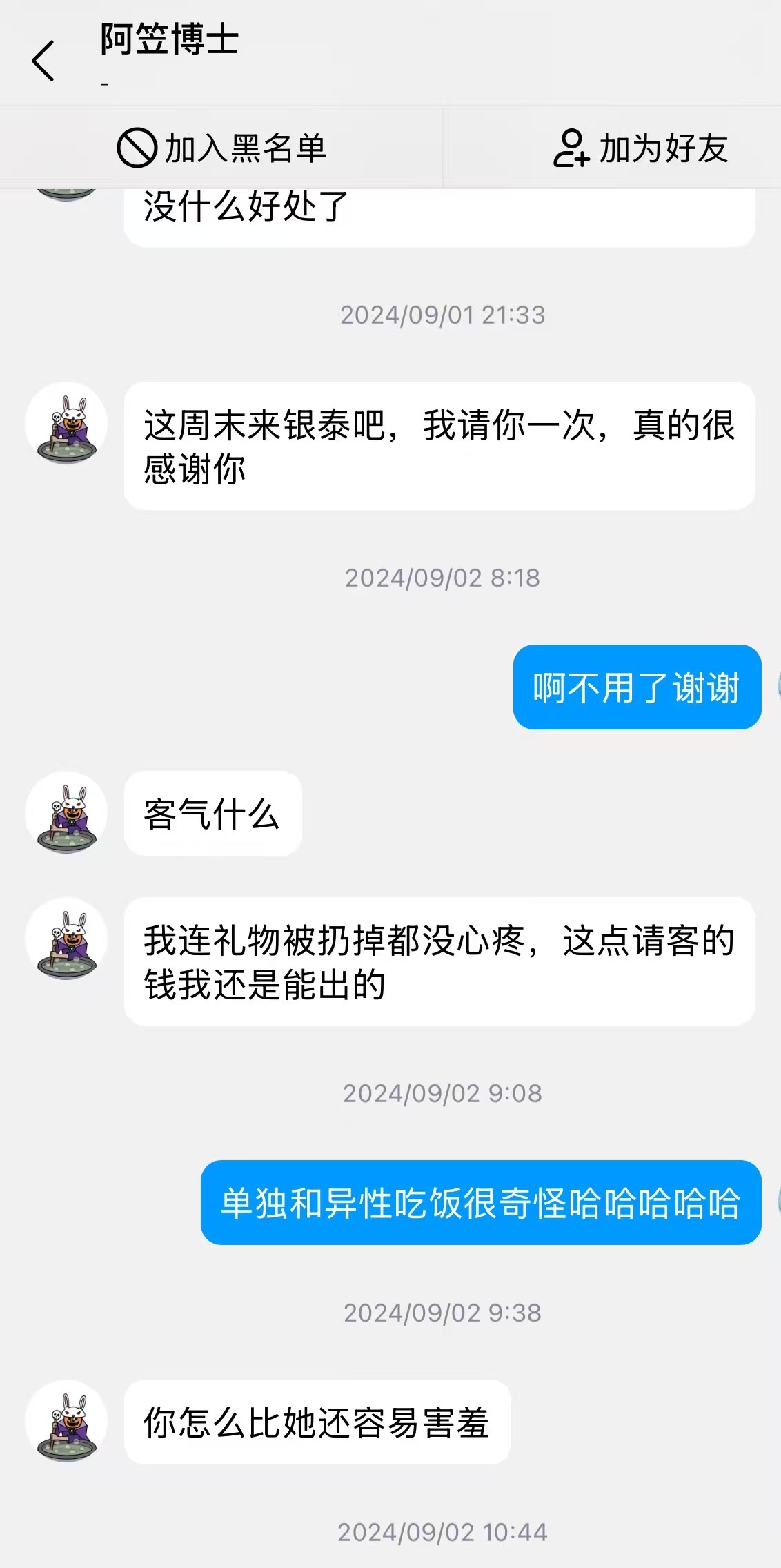 看了下评论区的聊天记录,不由得感叹谁说理工科不懂人情事故,同学们到底心理多强大才能和这种自以为是,自说自话的陌生人聊天。有时候不能怕事,如果早一些就不会纵容这自恋狂这么久了,要勇于维护自己的权利啊,敢于说不😠