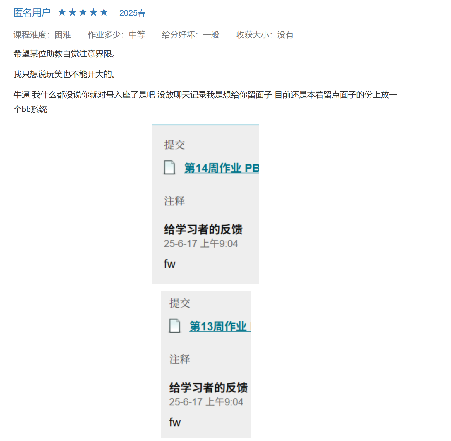 正如mmd学弟所述,“侮辱及贬低学生的学习或研究”在《助教手册第四版》的负面清单当中。即使助教与学生存在个人恩怨,都不应该在助教工作中辱骂学生,尤其是在专门用来收发作业的bb平台上,这是公报私仇。