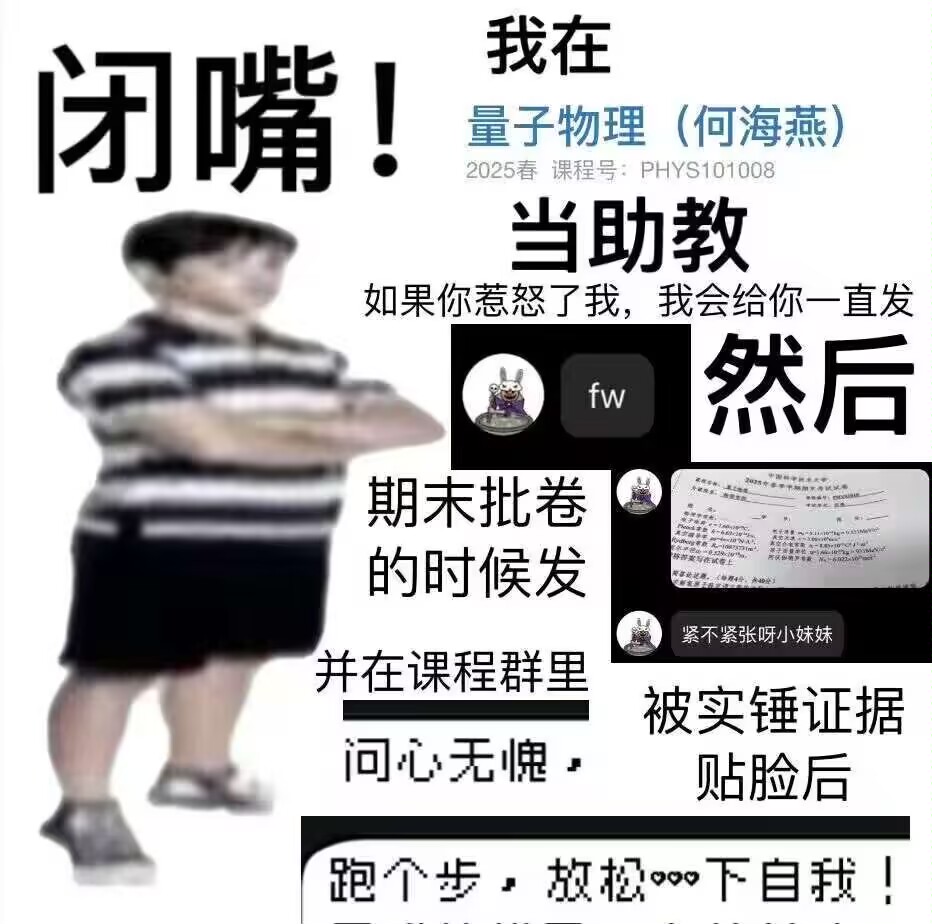 两位助教是我见过的最好的助教,十分细致负责、亲切亲民。如果你想正经学量子物理,两位助教会给你详细的资料,如果你只是想混个学分,两位助教也会提供力所能及的帮助,甚至和你一起吐槽zkd的奇葩课程。量子物理群在期末之后,在大家的自发组织下,一度还成为了随机过程和离散数学的复习群,这样的氛围非常棒。他们让我被AI英才班勾十置课塞满的大二下学期竟然在量子物理上找到了乐趣,最后出人意料地还算有不少收获。