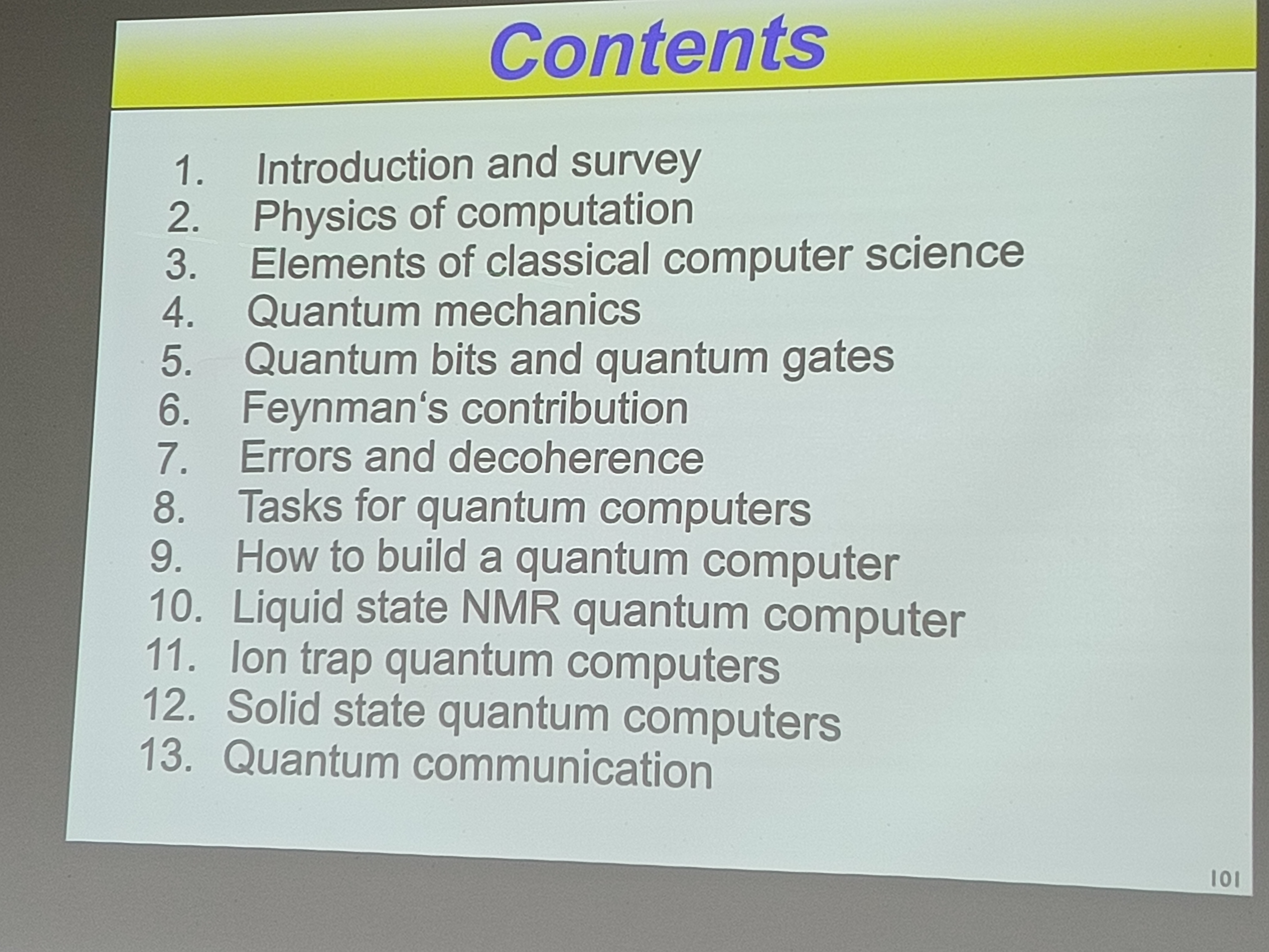 内容如上。前半学期讲量子计算基本概念,后半学期介绍实现量子计算机的各种物理系统。