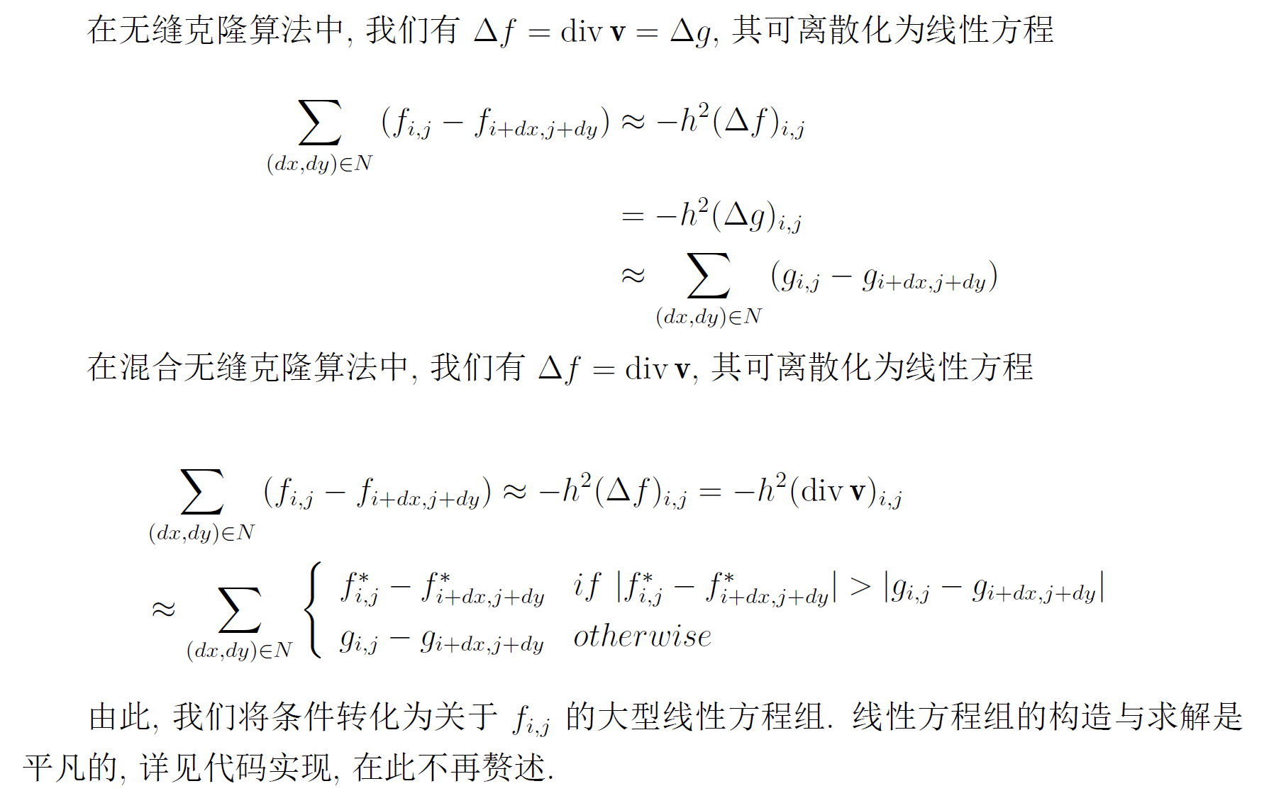 另外,学期中途突然加了一个大作业,这一点本身就缺乏规划。推荐的主题是Poisson Image Editing,个人感觉这个主题与数值代数的背景联系并不紧密,很难说通过这个大作业加深了对课程核心知识的理解。听说以前这门课的大作业是手写 SVD,感觉那个更靠谱一些。