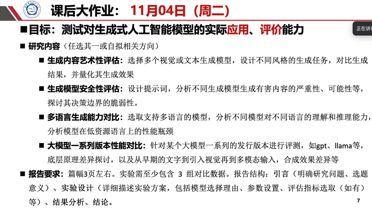 课程概况:本学期该课程共开东西两个课堂,高新区暂未开课,导致高新区同学的到课率比较感人。教学方式为负责课程的三个老师每人上五次课,课堂介绍生成式人工智能前沿知识和各种机器学习的背景内容等等。本课程从第二周开始上课,上到16周。西区课堂由于答辩时间压缩,15周即完成了所有课堂内容。