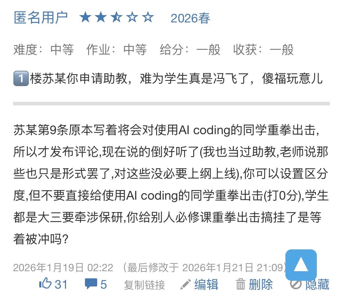 这可能也是许多同学最关心的。因为开学前一位助教“打击vibe coding”的言论引起了许多争议。我无意为这位助教开脱,但就像yxz助教说的,助教个人的发言甚至人品等都应该是私下谈论的事情,至少目前整个课堂的进程并不完全受这位助教控制。许多时候不应该无故迁怒这位助教。例如前段时间第一次作业成绩出来之后就有同学在评课社区怒喷这位助教的给分,但实际上第一次作业的打分并没有这位助教的参与。被指出后那位同学很快就删评了。当然个例不能反映总体,但这也一定程度上说明有的时候大家会被情绪裹挟,或许冷静下来再评论会更好。