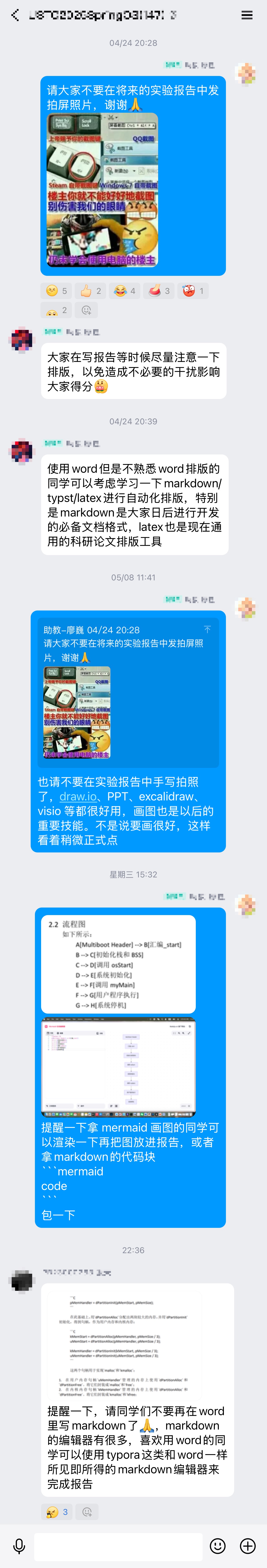 1. 部分实验报告质量低下:没有不允许 ai 写报告的意思,但你得检查一下自己写的是啥啊,ai 给你 mermaid 和 代码块 你就直接塞 word 里 ```mermaid ``` 是不是有点太过分了;还有拍屏拍个大灯在屏幕上镜面反射的、排版巨烂无比(首行随机空半行)、画个图手绘得贼草的(没有完全不允许手绘的意思);大量文字也是纯 aigc 凑数而并不准备真正复盘实验的。