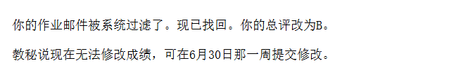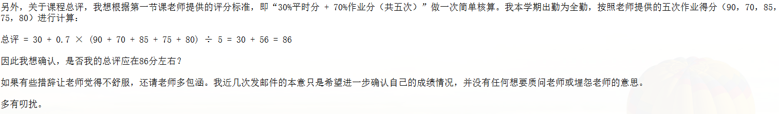 我无法质疑这些作业的打分,但是根据这个得分反馈,按照30%平时+70%作业计算出来的总评是86分,我能接受说因为优秀率限制下调一档,但是还是困惑为何最终结果是调整为B,于是我再次提出了疑问: