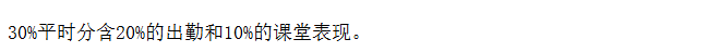 30%平时分 = 20%出勤+10%课堂表现。