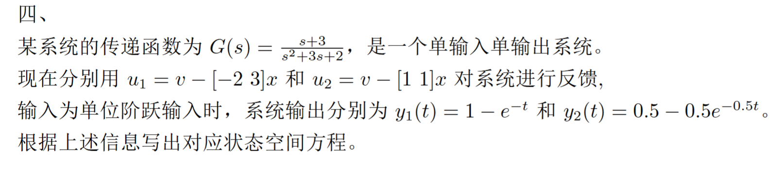 首先根据输入和输出写出传递函数,可以得知传递函数的极点被配置为多少,第一个应该是把-2的极点配置为-3.第二个是把极点配置为-3、-0.5,然后就是解极点配置问题了,这里可以采用标准型法,简单一点(根据k和k求出来线性变换矩阵Q,然后再根据Q、能控标准型的矩阵A B C求出原状态方程A、B、C)。个人见解可能有偏差,仅供参考。