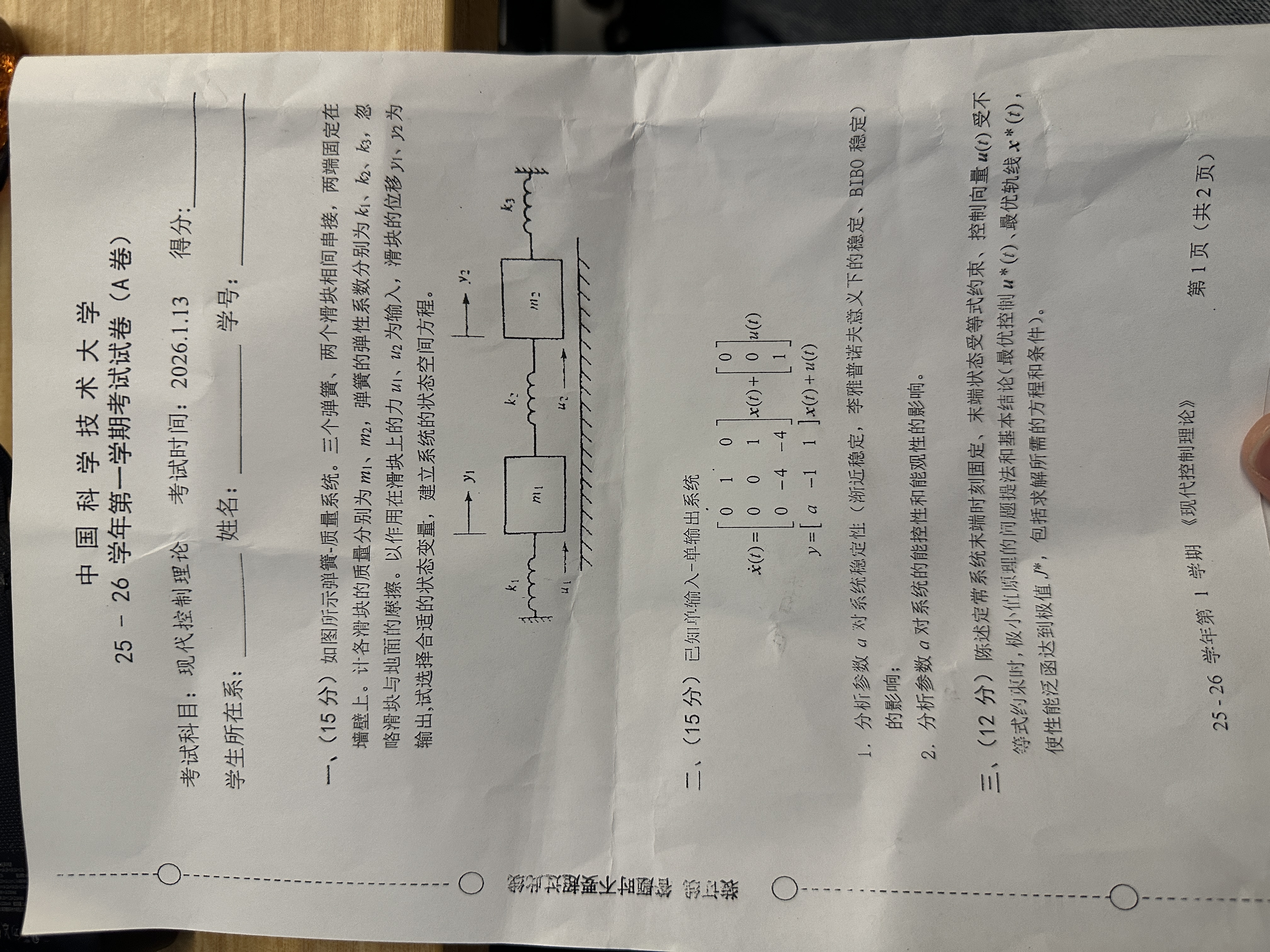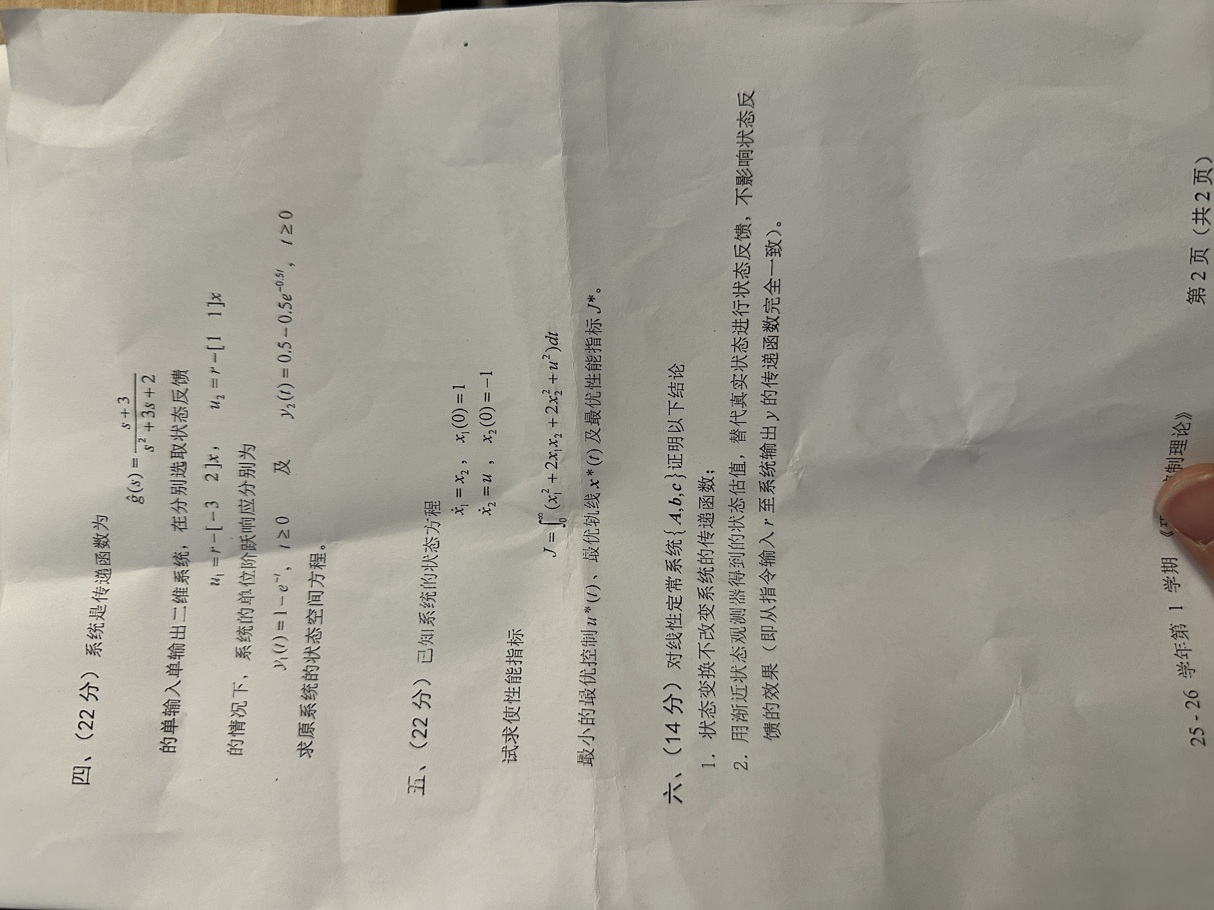 平时没怎么认真学,作业基本靠AI,今年考试6个题目,其中最优控制有32分左右内容,第一题就是看弹簧物块构建状态空间方程,第2题是判断稳定性,第三题是阐述最小值原理的相关信息,第四题是老爷子的创新题,22分,想必老爷子也知道题目难,监考的时候让助教自己做,不会了去找他,第5题有限时间二次型状态调节器,第6题两个证明题14分,估计每个证明题7分吧。