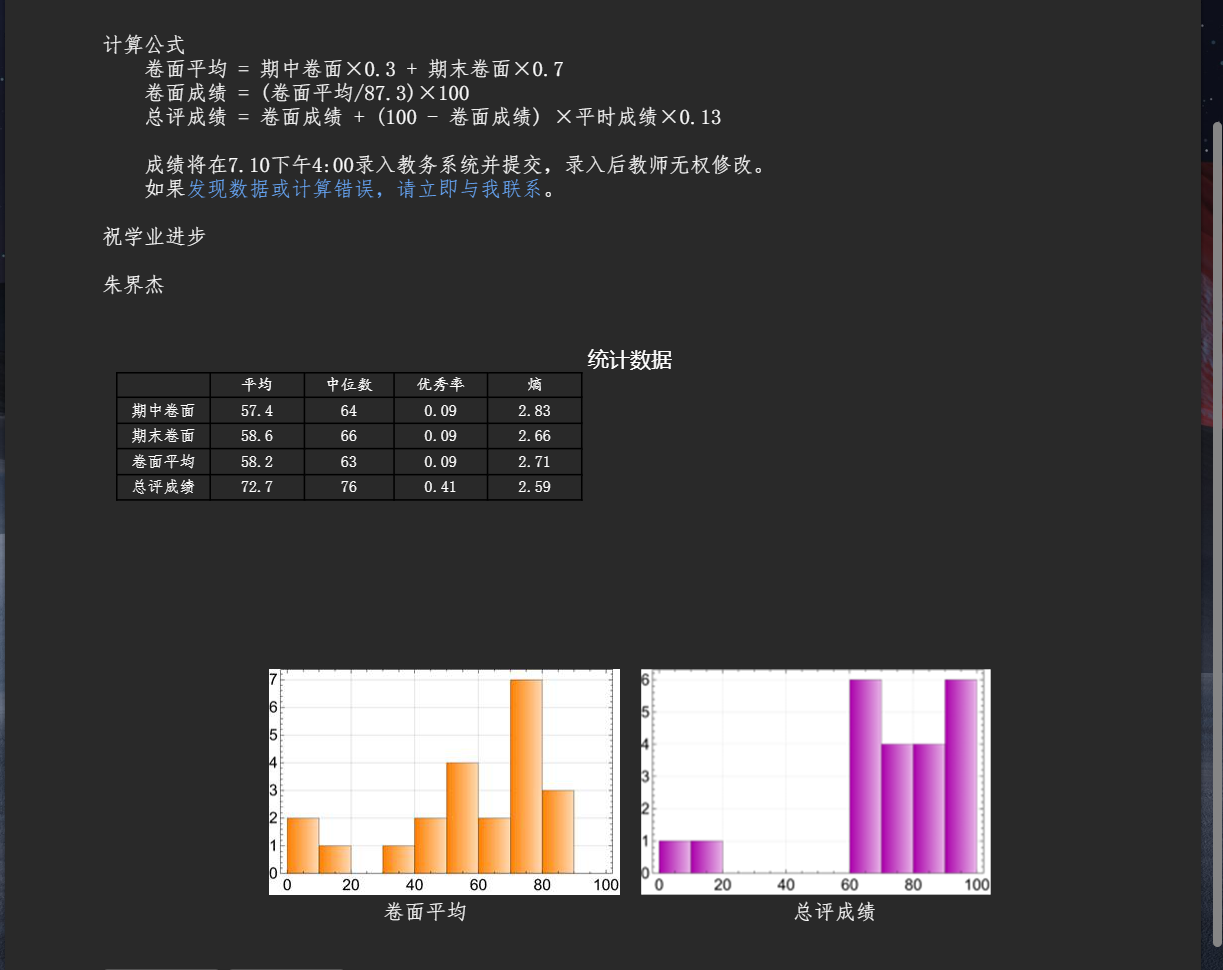 最后说给分。见下图,伟大,无需多言。(87.3应该是我们这个班最高的卷面平均分,0.13是调整优秀率用的,朱老师优秀率都是给满的)