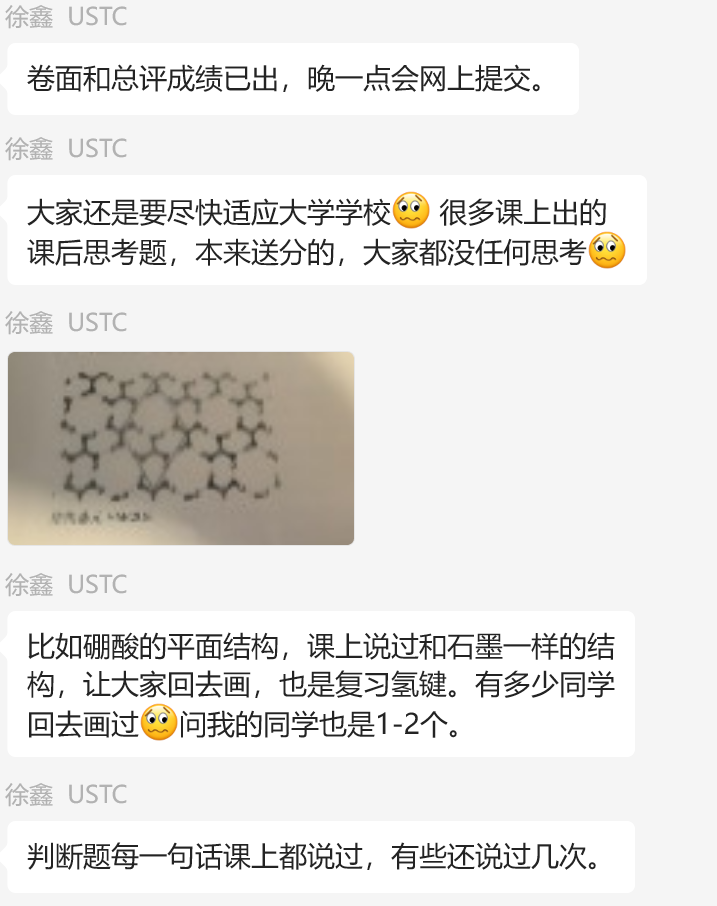 最后强调一下听课的重要性吧,很多考题老师其实都“不经意”间讲过。附一张期末考试后课程群的截图(注:硼酸晶体的平面结构是一道期末考题)。