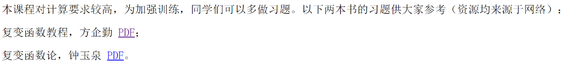 主要依照教材讲解,包含复变函数的基本概念和定理证明。推荐参考书籍,比如钟玉泉的参考书,有助于理解和练习。课程整体重视计算和理解,拓展内容较少。