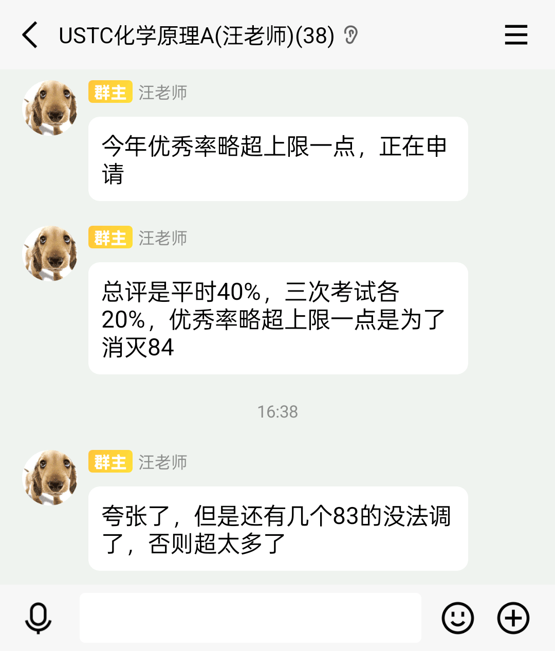 关于老师:汪老师人超级好,下课找他问问题都会耐心解答,每个单元的PPT也会发到群里,上课时思路清晰,有条不紊地将化学的原理娓娓道来,我认为是完全可以让我这种高中没有接触过化学竞赛的学生理解的。(就是讲课的时候会有咳嗽,给汪老师买个润喉糖吧ww)