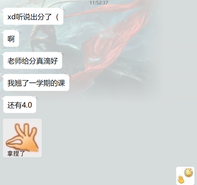 上了三个学期方老师的课,第四学期还将继续。方老师的课应该是中级班中作业、小测(大概3次)均最少的。英语一直在划水(尤其这学期课下花的时间几乎为零。。。),这次本指望弄个3+别太惨就好,然而居然拿了4.0,简直泪目。。。考虑到我平时除了被点到名未曾主动发过言,所以可能是听力考试运气比较好吧。。。