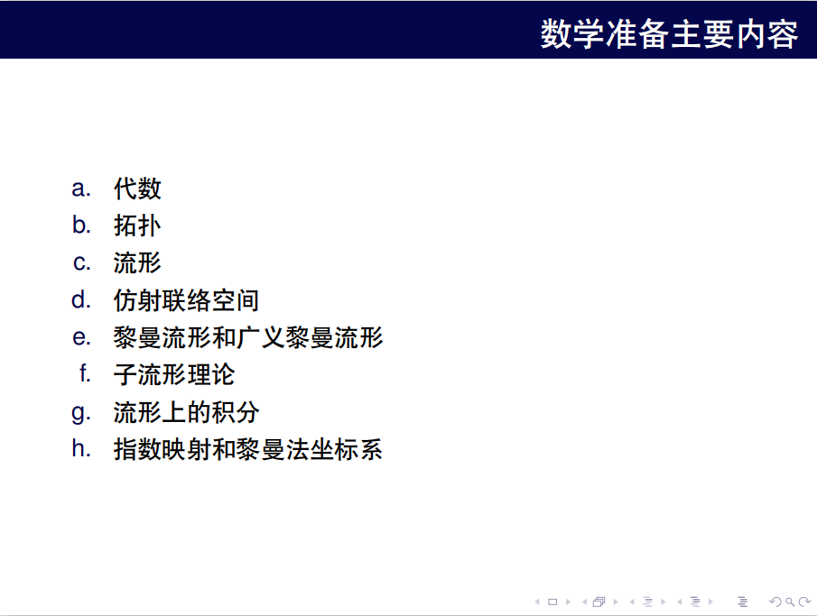 曹老师很注重数学,前八周讲了代数基础、拓扑、光滑流形、向量场、联络(向量丛呼之欲出不过没继续讲)、(半)黎曼几何,到第八周逐渐进入物理内容的学习。