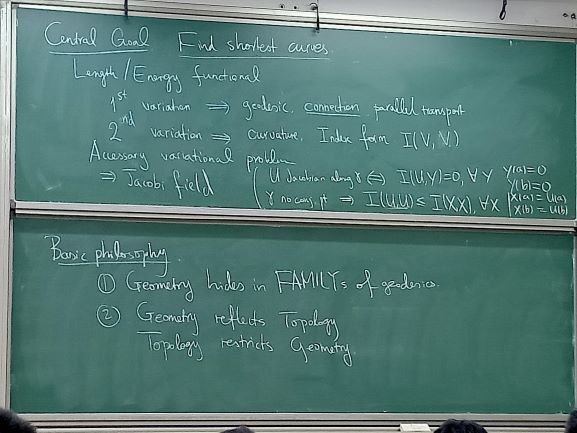 按老师的说法,基本的philosophy在于:Geometry hides in FAMILYs of geodesics. 意思是尽管一条测地线体现不了什么,但“一把”测地线就能反映很多信息。诸如指数映射、变分、Jacobi场、指标形式,其实都是按照这个精神出发的。运用这些基本工具,可以得到整体几何的一些结果。这又把几何和拓扑联系在一起,非常有趣。