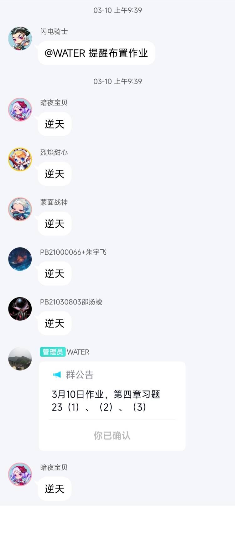 有时候会和同学水群。有次上课前群里一位匿名"闪电骑士