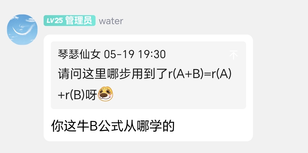 众所周知线代B1非常屑,这门课太注重技巧,忽略了很多东西,对于雾里人来说,这点东西肯定是完全不够用的。而且课本写得实在太烂了(高情商:给我们留下思考空间——xxw)。一个老梗: