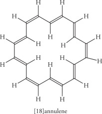 2.由于\(^{13}\)C在自然中丰度很低,出现在相邻原子的概率可以忽略不计,多数时候只能用来判断一下对称性。而\(^1\)H是主要的同位素,这个时候核子之间spin-spin coupling就能体现出来(也就是耦合常数J),因此可以揭示更多现象(branch, connectivity)。不过先说一下氢谱和碳谱共同点吧:积分(也就是面积而不是最高值)代表对应核子的相对数量,因为正比于跃迁吸收的光子数,因此可以体现对称性。对于氢而言,共轭效应比诱导效应对价电子密度影响要大,所以会看到碳上连了双键(无论另一头是碳还是氧)的场会比只是连了电负性强的原子(卤素或者氧氮)要更低(lowfield,也就是会出现在更左边),另外苯环的芳香性会比一般的共轭效应效果更强,这是由于ring current造成的(环流在碳链上,因此对碳无影响,但对氢有很大影响),比如以下这分子,外面那一圈氢比烯烃上的氢化学位移大很多,但里面那一圈氢由于内外环流附加磁场方向相反,化学位移竟然是负的(也就是场比TMS还要强,那么请问为什么不用这家伙作为标准样品?毕竟它对称性也很强——\(D_{6h}\)群元素同样也有24个,还有12种不可约群表示,而Td群只有5种)