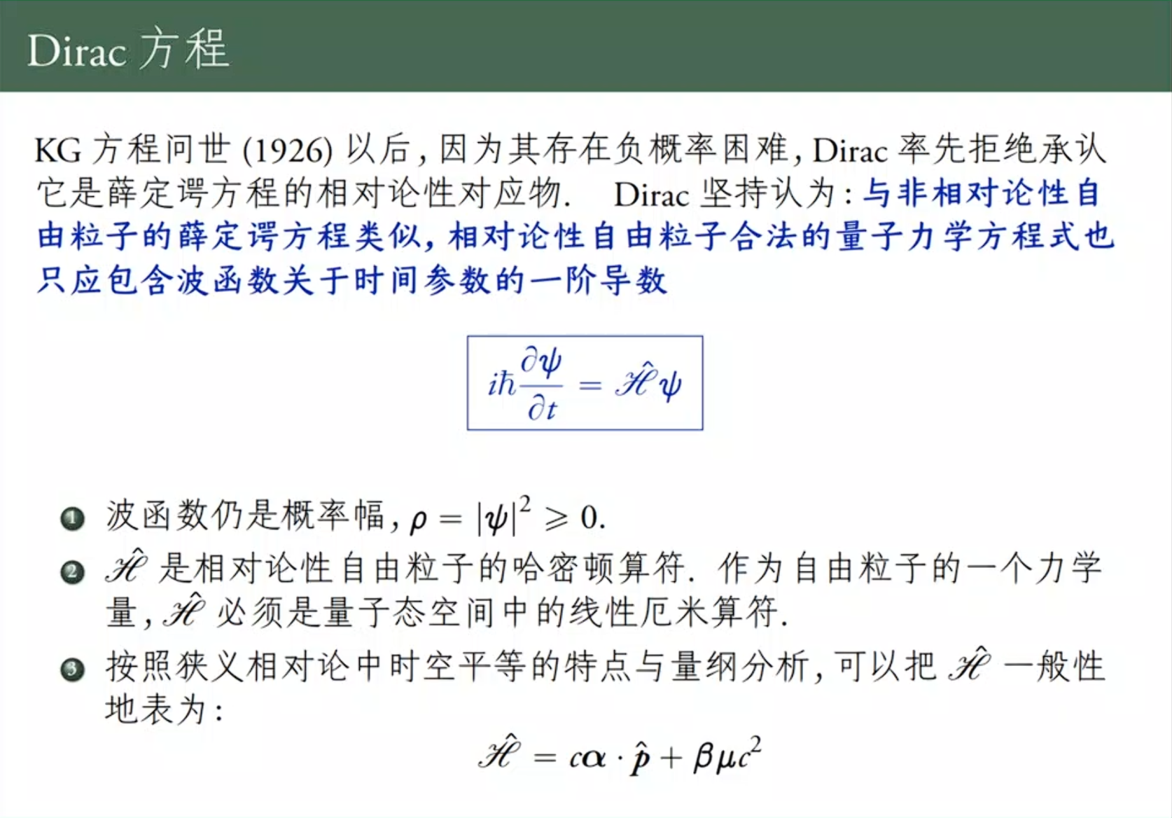引用的ppt只用看最后一行,具体的数学我就不搬上来了,但为了满足将薛定谔方程改写为空间的一阶偏微分形式,改写的哈密顿量又要满足平方后等于原哈密顿量的平方,所确定系数\(\alpha\)和\(\beta\)的反对易关系决定了系数只能是一个矩阵。因为矩阵的不对易性导致哈密顿量与粒子轨道角动量算符不对易,所以轨道角动量不守恒,为了弥补使得总角动量守恒,必须引入自旋。
