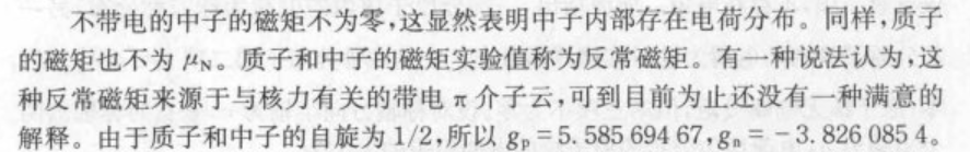 至于磁矩,原子物理其实已经有过说明(徐克尊228面),中子作为重子由夸克构成,虽然整体净电荷相互抵消了,但夸克自旋和运动造成的磁效应却依然存在。