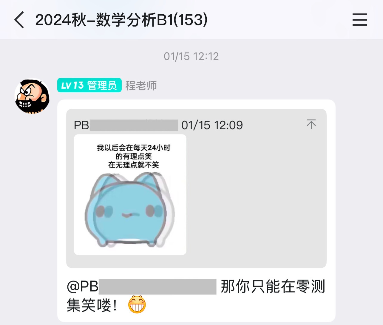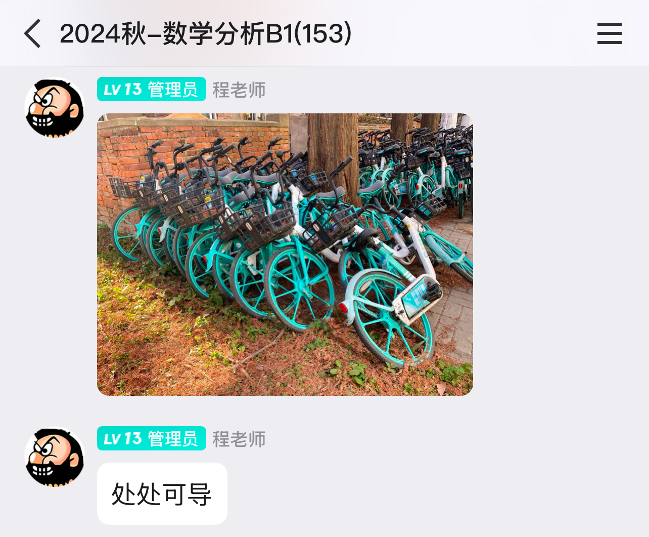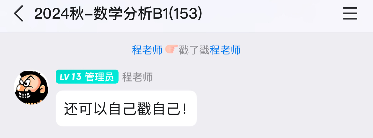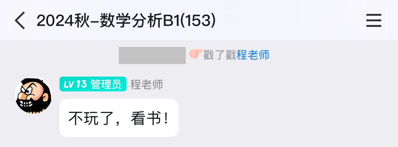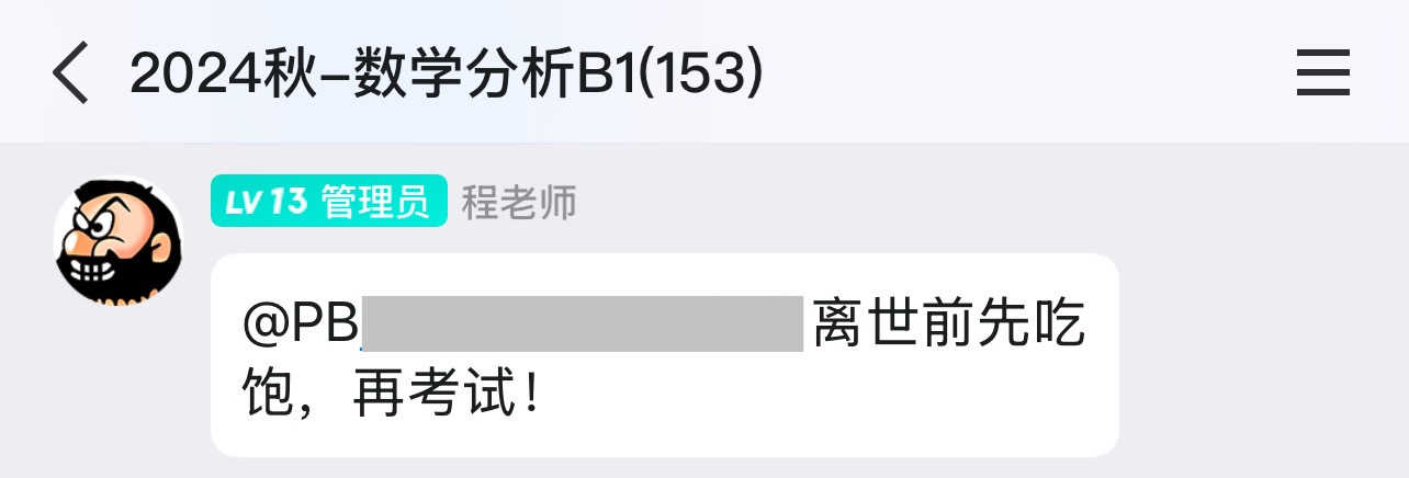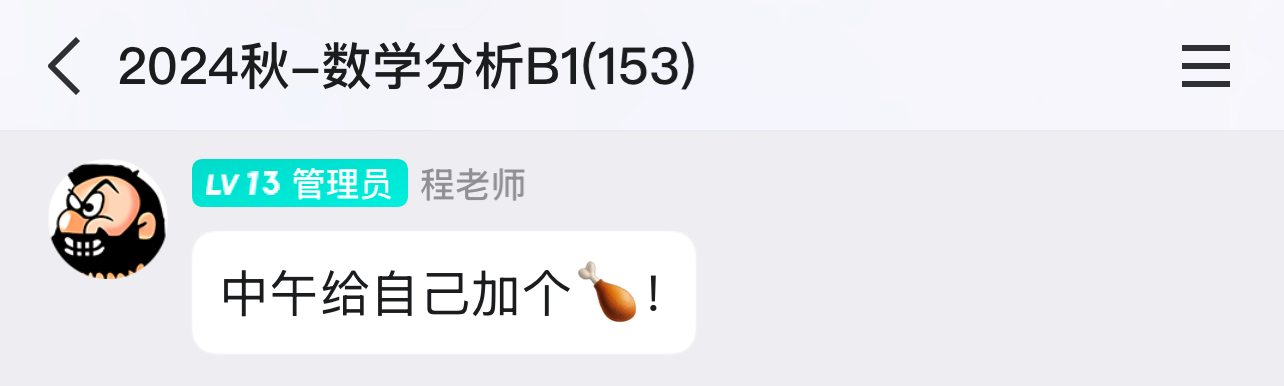 最后我想说一下程老师这个人,他真的超级真诚负责,让我有一种被看见的感觉。我一直抢程老师的第一排坐,感觉老师会有意地因为我没记完笔记而故意讲故事讲闲话让我记完笔记(当然这极有可能是自作多情了hhh),有谁掉了东西也会帮忙捡起来,考试之前为了缓解我们的紧张在群里陪着水群……临近期末我有一道题问了很多助教都没弄明白,最后我只能私信发给了程老师,老师不仅线上回了我,最后一次课的时候还在课上当众讲了一遍,说“数学就应该多交流”,最后那道题还被他放进了讲义。这种“被看见”我是从未在之前的数学学习中体验过的,可以说是程老师让我再也不会抵触数学。
