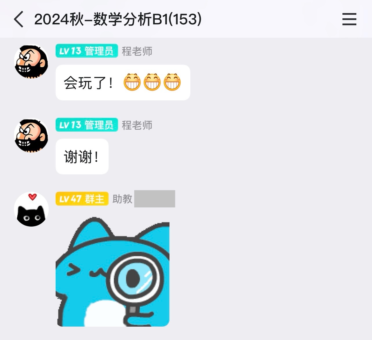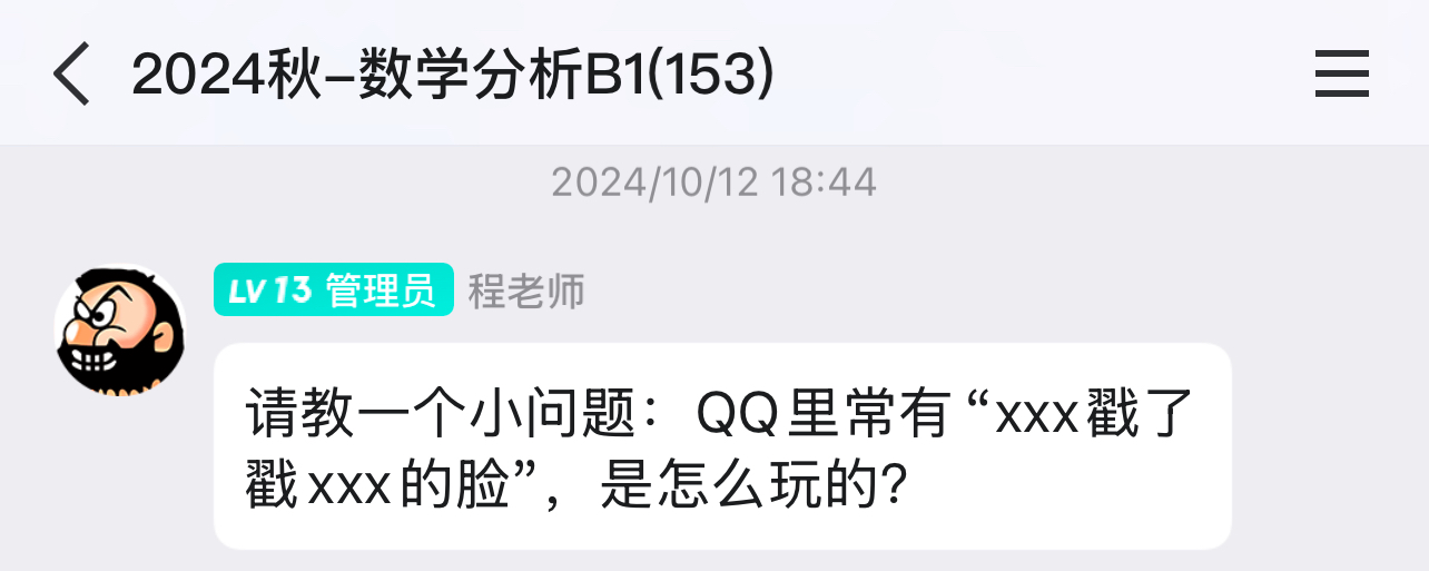 回到课堂本身。程老师的讲解专业程度无需多言,三位助教也是十分尽职尽责(再次感谢三位助教!)(我在一位名为猫猫w的助教那儿顺便领悟到自己对黑色猫猫表情包的喜爱,从而成为各大群里的黑猫表情包之王,甚至带上助教一起发猫猫表情包也是后话了)。不过最可贵的我认为还得是程老师那些看似随意闲聊的内容——内容很繁杂,但总结起来其实只有一个主题:教我们如何做人。上网随便搜一搜就能发现程老师的传奇经历(这里懒得放ref了),而这样一位历尽千帆的长者最后选择站上讲台,把他的知识和经验毫无保留的传给台下的所有同学,甚至还没有选择说教的方式,而是以邻家长者的身份和台下学生谈笑风生,怎能不让人生发敬佩之心?所以我得在此重申我的核心观点:能够上程老师的数分课,属实是一种幸运。所谓师者,莫过于此。