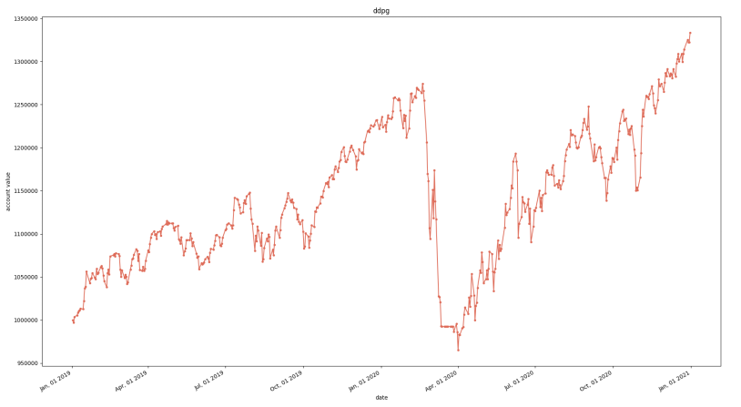 由于我很早就开始就进实验室做深度学习了,期中的时候又调研到有人用强化学习预测股票数据,就打算期末做这个。我自己手上又有项目中用的代码,直接移植以前的深度强化学习代码把网络结构稍作修改(用了PPO和DDPG,修改action space 和 reward),然后直接跑数据训练结果竟然不错,数据采用从2008-12-31到2020-12-31 Dow-Jones 30的股票数据,拿前面10年作为训练集,后面做测试,展示一下DDPG算法的结果: