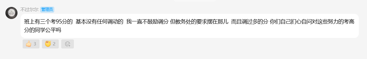 然后呢,在25年考试难度明显高于往年的情况下,在平均分非常低而且别的班都调分的情况下,说不调(甚至一开始还不让查卷),说什么为了公平云云。成绩分布图也不公布,排名也不说,还迅速解散了课程群。还在群里面说什么要不是教务处有要求他一分都不会调,所以只是捞了一下挂科的同学,上面的同学估计是没有怎么调分的。