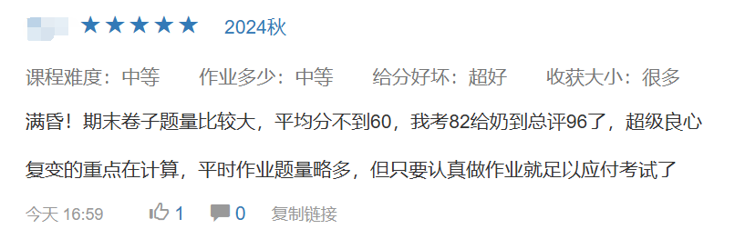 唯一不满意的点可能是给分吧,周三考试周六出成绩,直接卷面总评一起出。给分是严格37开,没有调分。如果说优秀率限制,我是可以理解。但是对于89,94或者未优秀的同学的分数,在不影响优秀率的前提下,是否可以再调整一下?